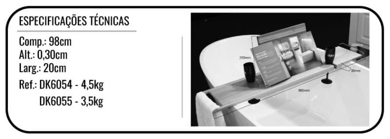 DadosLinhaLegnoAmbiente de UtilizaçãoBanheiraAtributosA Bandeja Legno é um acessório charmoso e que se adapta a todas as banheiras DOKA. Produzida em madeira natural com certificação ambiental ela faz parte da linha Legno e possui suporte para taças e objeto de leitura.